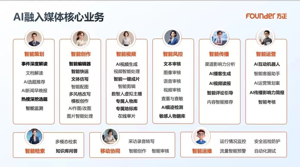 “十四五”期间,面对报业“云化、智能化、视频化、平台化”趋势,方正电子加速推进核心产品的迭代升级:“方正云雀新一代智媒平台”采用云原生和微服务架构,集成全链路智能工具,既支持大型报业集团深度融合建设,也以SaaS化模式为中小型媒体提供轻量化解决方案;“方正魔方媒体大模型”及AIGC创作器,基于媒体专属数据训练,打造AI辅助选题、智能创作等核心功能,构建人机协同新范式;“智能审校”产品依托NLP技术与大模型优势,实现文、图、音、视频多模态内容审核,筑牢内容安全防线。